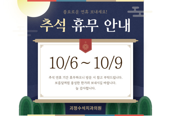 2025년 추석연휴 안내 작성일 25-09-30 조회수 26 본문 괴정수석치과 추석연휴 안내입니다. 이전글11월 진료 일정 25.10.27 다음글2025년 개천절, 한글날 진료안내 25.09.30 목록보기
