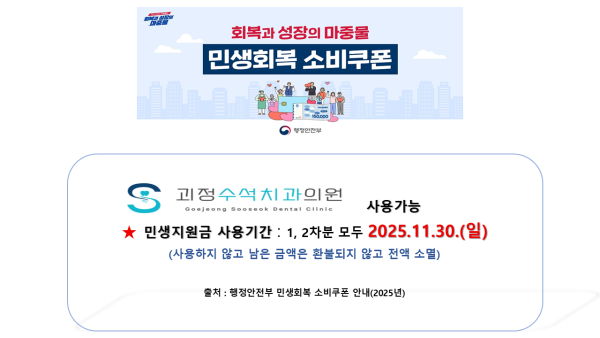 민생회복 소비쿠폰 작성일 25-09-10 조회수 69 본문 민생회복 소비쿠폰도 유통기한이 있다는 사실을 알고계시나요? 이전글2025년 개천절, 한글날 진료안내 25.09.30 다음글무절개 가이드 네비게이션 임플란트 안내 25.08.28 목록보기